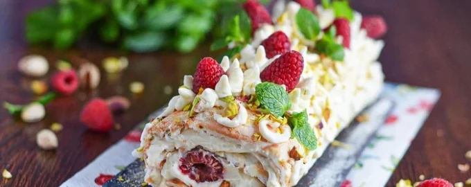 - Разпределете крема върху охладената торта и поставете плодовете отгоре. С помощта на пергамента внимателно навийте меренга на руло. Ако кората се напука, не се притеснявайте – тя трябва да се навие. Накрая увийте меренга рулото изцяло в пергамента и го поставете в хладилника за 1-2 часа, за да може кремът да се стабилизира. Охладеният десерт ще бъде готов за сервиране, украсен с плодове, сметана, шоколад, кокосови стърготини или други добавки.