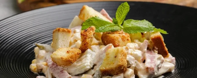 - Подредете крутоните върху повърхността на салатата и сервирайте веднага.