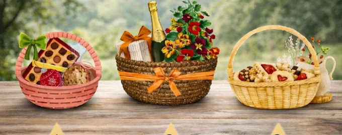 Представете си, че днес е вашият рожден ден или някакъв друг голям празник. Разгледайте изображенията на три кошници и помислете коя от тях бихте искали да получите като подарък. Обмислете не само съдържанието, но и формата и цвета на самата кошница.