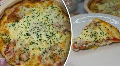 След това върху плънката поставяме нарязани на кръгчета домати и слагаме царевица. Печем ястието във фурна, загрята до 200 градуса по Целзий, в продължение на 20 минути. След това намаляваме температурата на 180 градуса и печем вечерята още 25 минути. Десет минути преди да се изпече, поръсете ястието със сирене.