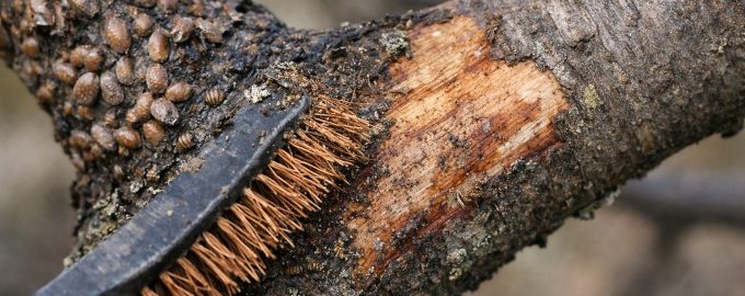 Важно: никога не изстъргвайте щитоносното дърво с голи ръце или с градински нож, без да дезинфекцирате инструмента, тъй като яйцата на вредителя могат да останат под ноктите или по острието и да се пренесат на съседните дървета.