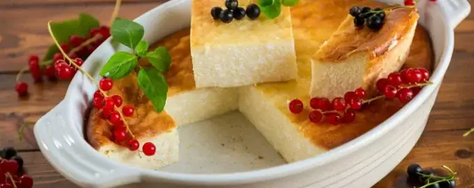 Запеканка от извара с нишесте, приготвена без брашно и грис, резултатът е лек, нежен и въздушен. Сервира се за закуска или като десерт със заквасена сметана, сладко или мед.