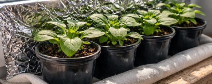 Отразяващ екран. Поставете обикновен лист бял картон или изолационно фолио между стъклото и саксиите. Това ще намали температурата на почвата с 5-7 градуса.
