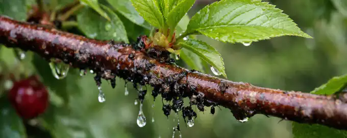 Внимателно прегледайте черешовото дърво, като обърнете специално внимание на долната страна на младите листа и върховете на леторастите, където най-често се натрупва черешова зараза. Мравки.