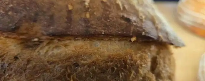 Хлябът е с дебела, хрупкава коричка и перфектни трохи.