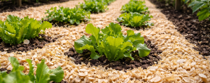 Светлите стърготини отразяват слънчевите лъчи, като предпазват нежните корени на разсада от прегряване в майските горещини.