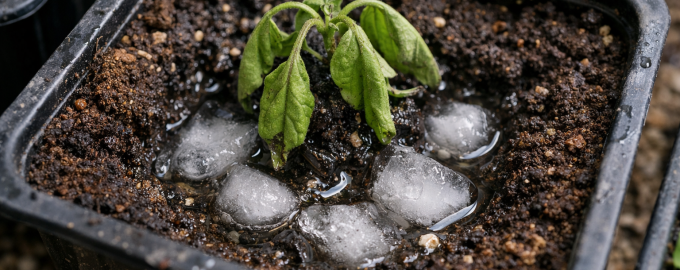 | Ледена вода | Температурен шок и смърт на малки корени | Листата увяхват при влажна почва |