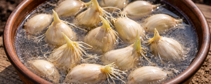 Подготовка на посадъчния материал Основата на едно силно растение се полага още преди то да попадне в земята. Важно е да се извърши правилно дезинфекция на карамфилите и стимулира образуването на корени само с помощта на естествени съставки. Избрани пролетен чесън реагира най-добре на леки органични разтвори, които не изгарят покълващите корени.