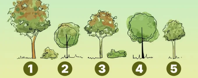 На изображението са показани пет различни дървета, които се различават по размера и формата на короните си. Сред тези снимки изберете тази, която ви се струва, че в най-голяма степен съответства на вашата личност. Можете да визуализирате собствената си градина и да помислите кои от растенията биха могли да растат в нея.