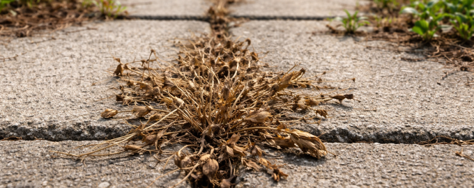 Най-бързият начин за премахване на обрастванията между плочките или по градинските пътеки е използването на концентрирана киселина от естествен произход. Обикновеният трапезен оцет разрушава клетъчните мембрани на нежеланите прорастъци, като ги кара бързо да се свият.